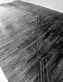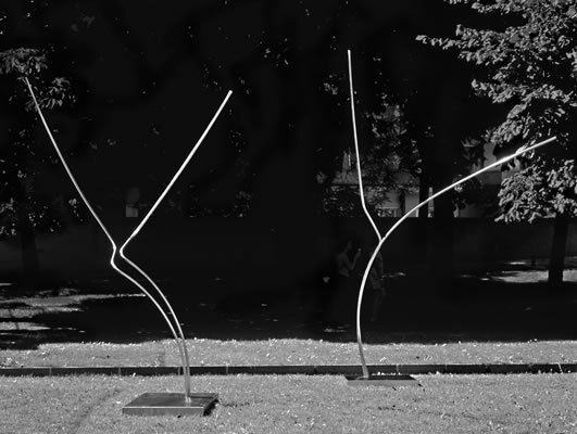 Un minimo di materia che la luce visualizza e rende trasparente nel loro procedere. Spazio inerte, sfiorato e percorso,da segni che si flettono, si espandono, e si adagiano in esso.